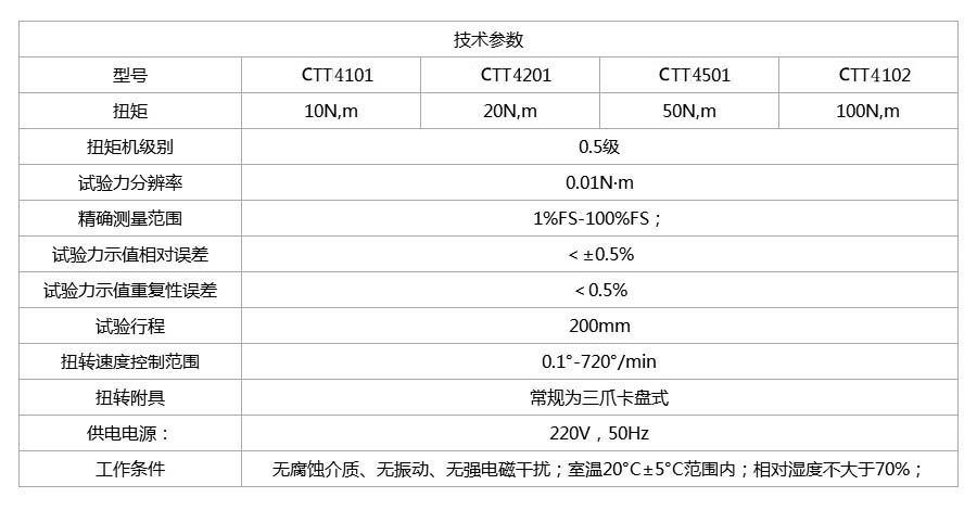 Equipment name: Microcomputer controlled bone screw torsion testing machine Models: CTT4101, CTT4201, CTT4501, CTT4102 Product Overview: The TTM-201 electronic torsion testing machine for bone screws is suitable for testing and analyzing the torsional mechanical properties of metal materials, non-metal materials, composite materials, as well as medical devices such as bone screws, biomaterial surgical implants, bone joint implants, intramedullary fixators, metal bone screws, hollow bone screws, etc. Can automatically calculate TeH, TeL, Tm τ EH τ EL τ M τ Test parameters such as p0.2 and G. Can meet special testing requirements of users. It can achieve closed-loop control such as constant rate loading, constant rate torque angle, and constant rate angle, and can conduct process qualification performance verification tests on materials or products. Equipped with a torsion angle extensometer, it can automatically calculate the shear modulus G, and the test results can be saved, queried, and printed. Meet and apply standards This testing machine is manufactured in accordance with GB/T 2611-2007 General Technical Requirements for Testing Machines, GB/T10128-1998 Metal Room Temperature Torsion Test Method, and JB/T9370-1999 Technical Conditions for Torsion Testing Machines. Inspection standard: JJG269-2006 Torsion Testing Machine Test method: YY/T0018-2016 "Metal bone screws for bone grafting implants" YY/T0662-2008 "Mechanical Performance Requirements and Test Methods for Metal Bone Screws with Asymmetric Thread and Spherical Undersurface Metal for Surgical Implants" ISO 6475:1989 "Implants for surgery - Metal bone screws with asymmetric thread and spherical undersurface - Mechanical requirements and test methods" YY/T0345.1-2011 "Surgical Implants Metal Bone Nails" YY/T0591-2011 Metal interlocking intramedullary nails for bone joint implants YY/T1505-2016 "Test method for self tapping performance of metal bone screws for surgical implants" YY/T1506-2016 "Test method for rotational torque of metal bone screws for surgical implants" This testing machine was calibrated and accepted in accordance with the JJG 269-2006 Verification Regulations for Torsion Testing Machines. Applicable standards: Conduct tests and provide data in accordance with international standards such as GB, ISO, DIN, ASTM, JIS, BS, etc.
