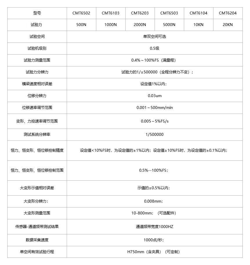 Equipment name: Microprocessor controlled electronic universal testing machine Product models: CMT6502, CMT6103, CMT6203, CMT6503, CMT6104, CMT6204 Product Overview: This equipment is suitable for testing the mechanical properties of metallic materials, non-metallic materials, and composite materials, as well as analyzing and researching the process performance. Equipped with corresponding fixtures, it can perform tests such as tension, compression, bending, shearing, tearing, peeling, bursting, and fatigue. It can automatically calculate parameters such as test force, fracture force, elongation, tensile strength, yield strength, compressive strength, elastic modulus, shear strength, tear strength, peel strength, etc. At the same time, it can also achieve testing requirements such as constant elongation stress, constant stress elongation, and load retention. This machine is widely used for material inspection and analysis in industries such as construction materials, aerospace, mechanical manufacturing, wires and cables, rubber and plastics, automotive manufacturing, powder metallurgy, bolts, etc. It is a conceptual testing equipment for scientific research institutions, colleges and universities, industrial and mining enterprises, technical supervision, commercial inspection and arbitration, and other departments. Experiments can be conducted according to standards such as GB, ASTM, DIN, ISO, JIS, BS, etc. Manufacturing standard for testing machines: GB/T 16491-2022 Electronic Universal Testing Machine GB/T 228-2010 "Metallic Materials Room Temperature Tensile Test Method" GB/T 232-2010 "Metallic Materials Bending Test Method" GB/T 7314-2007 "Metallic Materials Room Temperature Compression Test Method" (Users can provide relevant test standards, no more than 5) Product details: The host adopts a single space structure, and the experimental space is pulled down and pressed down, mainly composed of a base and a frame. The base is made of cast iron, and the frame is a gantry structure, mainly composed of a bottom plate, upper, middle, and lower crossbeams, and connecting light bars; The coaxiality of the testing machine is good (<8%). The upper, middle, and lower beams are made of ductile iron, with a tensile strength of 60k (600MPa) and a yield strength of 40k (400Mpa); High strength light bars are used to fix the upper crossbeam and worktable, forming a highly rigid structural framework. The corrosion and oxidation resistance of ductile iron exceed that of cast steel. Due to the microstructure of nodular graphite in ductile iron, it is superior to cast steel in reducing vibration ability, making it more conducive to stress reduction. This machine has a beautiful appearance, good stability, high rigidity, high control accuracy, high work efficiency, low noise, and is energy-saving and environmentally friendly. This series of models has multiple optional model structures, including space models, pull-up and pull-down dual space models, and pull-down and pull-down dual space models. Environmental boxes and high-temperature furnaces can be added for environmental testing.