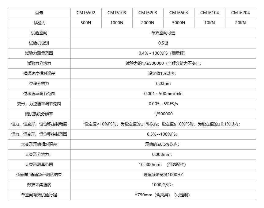 Equipment name: Microprocessor controlled electronic universal testing machine Product models: CMT6502, CMT6103, CMT6203, CMT6503, CMT6104, CMT6204 Product Overview: This equipment is suitable for testing the mechanical properties of metallic materials, non-metallic materials, and composite materials, as well as analyzing and researching the process performance. Equipped with corresponding fixtures, it can perform tests such as tension, compression, bending, shearing, tearing, peeling, bursting, and fatigue. It can automatically calculate parameters such as test force, fracture force, elongation, tensile strength, yield strength, compressive strength, elastic modulus, shear strength, tear strength, peel strength, etc. At the same time, it can also achieve testing requirements such as constant elongation stress, constant stress elongation, and load retention. This machine is widely used for material inspection and analysis in industries such as construction materials, aerospace, mechanical manufacturing, wires and cables, rubber and plastics, automotive manufacturing, powder metallurgy, bolts, etc. It is a conceptual testing equipment for scientific research institutions, colleges and universities, industrial and mining enterprises, technical supervision, commercial inspection and arbitration, and other departments. Can be based on:Conduct experiments according to standards such as GB, ASTM, DIN, ISO, JIS, BS, etc. Test standards met by the equipment: Manufacturing standard for testing machines: GB/T 16491-2022 Electronic Universal Testing Machine; Meet the test method standards: GB/T1040-2006 "Determination of tensile properties of plastics" GB/T1041-2008 "Determination of compressive properties of plastics" GB/T9341-2008 "Determination of bending properties of plastics" GB/T 228-2010 "Room temperature tensile test method for metallic materials" GB/T 7314-2007 "Room temperature compression test method for metallic materials" (users can provide relevant test standards, no more than 5) The main components of the equipment: The CMT6000 series microcomputer controlled electronic universal testing machine is an electromechanical integrated product, mainly composed of a host (including frame, base, transmission system), fixtures, deformation measurement system, software system, and electrical system. N Fixture: a universal and specialized fixture for various materials, with convenient operation and reliable clamping. Can be configured with pneumatic and hydraulic fixtures, greatly improving work efficiency. The clamping force is adjustable to meet the testing requirements of users for different materials.