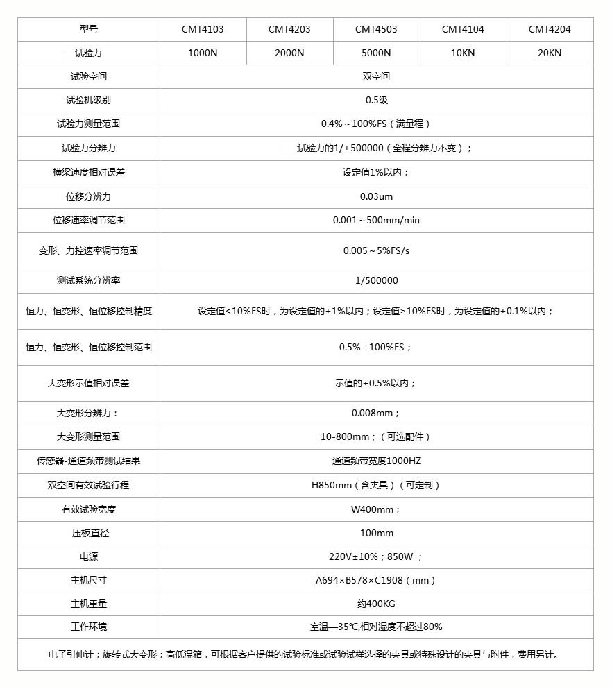 Equipment name: Microprocessor controlled electronic universal testing machine Product models: CMT4103, CMT4203, CMT4503, CMT4104, CMT4204 Main functions of the equipment: This equipment is suitable for testing the mechanical properties of metal materials, non-metallic materials, and composite materials, as well as analyzing and researching the process performance. Equipped with corresponding fixtures, it can perform tests such as tension, compression, bending, shearing, tearing, peeling, bursting, and fatigue. It can automatically calculate parameters such as test force, fracture force, elongation, tensile strength, yield strength, compressive strength, elastic modulus, shear strength, tear strength, peel strength, etc. At the same time, it can also achieve testing requirements such as constant elongation stress, constant stress elongation, and load retention. This machine is widely used for material inspection and analysis in industries such as construction materials, aerospace, mechanical manufacturing, wires and cables, rubber and plastics, automotive manufacturing, powder metallurgy, bolts, etc. It is a conceptual testing equipment for scientific research institutions, colleges, industrial and mining enterprises, technical supervision, commercial inspection and arbitration, and other departments. The host adopts a (single) dual space structure, and the experimental space is pulled up and pressed down (pulled down and pressed down), mainly composed of a base and a frame. The base is made of cast iron, and the frame is a portal structure, mainly composed of a bottom plate, upper, middle, and lower crossbeams, and connecting light bars. The crossbeams are made of steel parts. Using high-strength light bars to fix the upper crossbeam and worktable, forming a highly rigid structural framework. Experiments can be conducted according to standards such as GB, ASTM, DIN, ISO, JIS, BS, etc. Test standards met by the equipment: Manufacturing standard for testing machines: GB/T 16491-2022 Electronic Universal Testing Machine; Meet the test method standards: GB/T1040-2006 "Determination of tensile properties of plastics" GB/T1041-2008 "Determination of compressive properties of plastics" GB/T9341-2008 "Determination of bending properties of plastics" GB/T 228-2010 "Room temperature tensile test method for metallic materials" GB/T 7314-2007 "Room temperature compression test method for metallic materials" (users can provide relevant test standards, no more than 5)