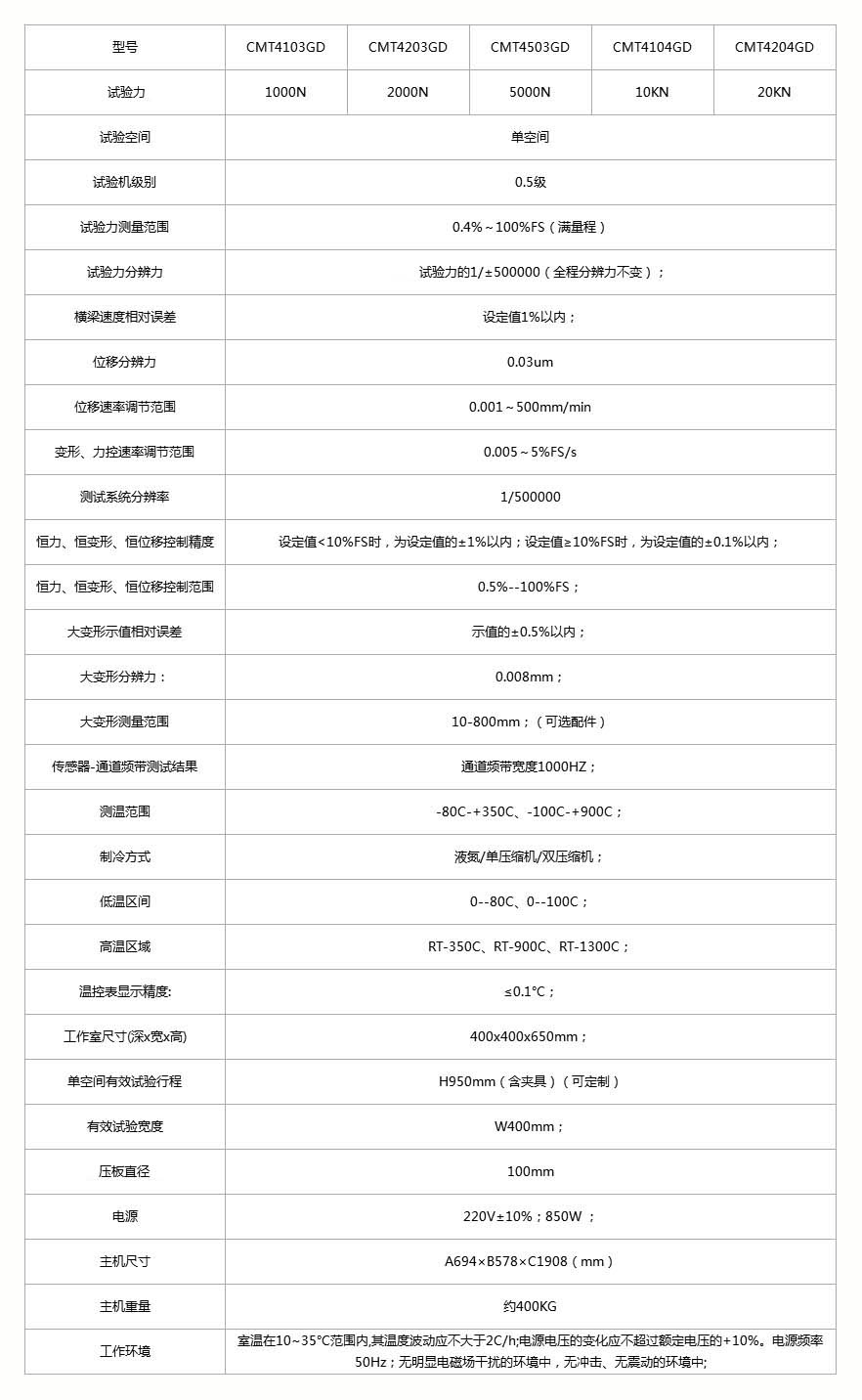 Equipment name: Microcomputer controlled high and low temperature electronic universal testing machine Product models: CMT4103GD, CMT4203GD, CMT4503GD, CMT4104GD, CMT4204GD Main functions of the equipment: The high and low temperature tensile and pressure testing machine is equipped with a CMT series temperature controlled high and low temperature test box, a high-temperature furnace, and a high-temperature environmental testing device. The high and low temperatures are manufactured according to the Q/UHT-2009 "Standard Method for High Temperature, High and Low Temperature Tensile Testing", and the CMT0150 test box, CMT0350 test box, CMT0350 test box, CMT600 test box, and CMT900 test box are optional. The machine tests the various physical and mechanical test properties of materials under different environmental temperatures such as high temperature, high temperature, and low temperature, It can meet the testing and measurement needs of various materials, and the measurement and control software can expand its functions according to user requirements. High temperature, high and low temperature testing machines are widely used in aerospace, petrochemicals, mechanical manufacturing, new materials, polymer materials, adhesives, ceramic building materials, metal materials, as well as higher education institutions, research institutions, technical supervision, quality inspection stations and other departments. Experiments can be conducted according to test standards such as GB/ISO/ASTM/JIS/DIN/EN/FL/HB.