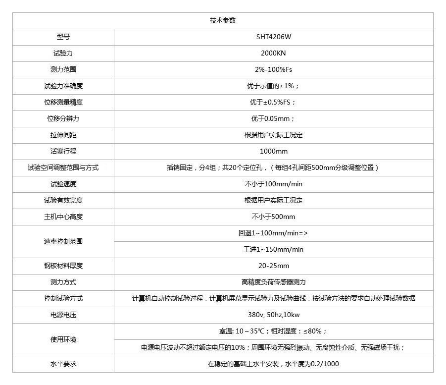 Product Name: Micro computer controlled electro-hydraulic servo horizontal tensile testing machine Product model: SHT4206W Product Overview: The design of the host and auxiliary equipment of the microcomputer controlled servo horizontal tensile testing machine integrates our company's advanced technology, with a beautiful appearance, convenient operation, and stable and reliable performance. The testing machine adopts a frame structure with integral steel plate welding, and a single rod double acting piston cylinder applies test force through a reverse frame composed of a moving crossbeam rod and a front pull head. The sample is connected by a pin shaft, and high-precision load sensors measure the force. The stretching space of the rear pull head can be adjusted step by step according to the length of the sample specifications. The rear pull head is adjusted by electric deceleration, and is manually fixed to both sides of the frame by pin shifting, This machine is mainly suitable for testing the tensile strength of rope materials such as power accessories, wires and cables, double hooks, safety belts, chains, chain hoists, large standard components, steel wire ropes, steel strands, etc., by displaying test forces and test curves on computer screens and automatically processing test data according to the requirements of test methods.