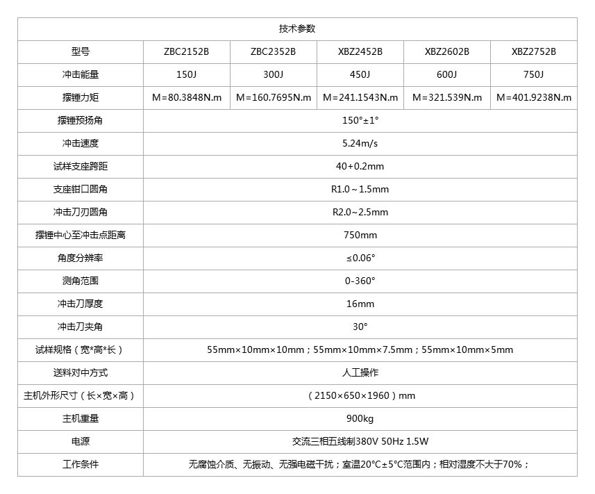 Product Name: ZBC3000B Series Liquid Crystal Metal Pendulum Impact Tester Product models: ZBC2152B, ZBC2352B, ZBC2452B Product Function Overview: This testing machine adopts a dual arm design and is an instrument for testing the impact resistance performance of metal materials under dynamic loads. It can continuously and extensively conduct metal impact tests, display impact absorption energy, impact toughness, pendulum rotation angle, and print test reports. It is an essential testing instrument for metal material manufacturers and quality inspection departments, as well as an indispensable testing instrument for scientific research institutions to conduct new material research. This model can be equipped with a fully automatic sample delivery system, which can greatly improve testing efficiency and reduce the labor intensity of testing personnel. It is an essential testing instrument for metal material manufacturers and quality inspection departments, as well as an indispensable testing instrument for scientific research units to conduct new material research. Related execution standards: This machine is developed and produced in accordance with the standard GB/T 3808-2002 "Inspection of Pendulum Impact Testing Machines". It conducts impact tests on metal materials in accordance with the national standard GB/T 229-2007 "Charpy Pendulum Testing Method for Metal Materials" and complies with JJG 145-2007 "Verification Regulations for Pendulum Impact Testing Machines". If the structural form is changed and relevant parts are replaced, the requirements of international standards such as ASTM E23, EN 10045, ISO 148, and ISO 83 can be met simultaneously.