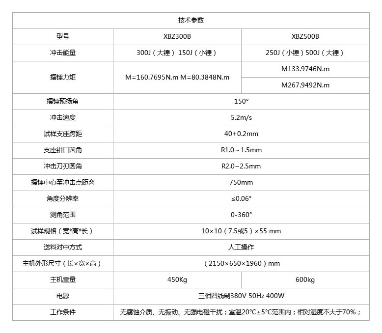 Product name: XBZ3000B series digital display semi-automatic pendulum impact testing machine Product models: XBZ300B, XBZ500B Product Function Overview: This machine is equipped with a LCD digital display controller, which has dual control and dual display functions. The LCD digital display controller adopts PLC control and measurement, and calculates the rebound angle of the pendulum based on the rebound angle of the punched sample measured by rotary encoder, automatically displaying the rebound angle β The absorption work done by the pendulum on the sample, as well as the impact toughness ak value, can also be printed with the addition of a micro punch, including test data, average work of three tests, and test time and serial number. The main body of this machine is made of cast steel material, which makes it rigid and stable throughout the entire testing process, has strong impact resistance, is not easily deformed, the test results are accurate, and the service life is long. Adopting a high torque clutch and a high-power motor makes it more stable and vibration free during swing and release. Related execution standards: This machine is developed and produced in accordance with the domestic standard GB/T 3808-2002 "Inspection of Pendulum Impact Testing Machines". It conducts impact tests on metal materials in accordance with the national standard GB/T 229-2007 "Charpy Pendulum Testing Method for Metal Materials" and complies with JJG 145-2007 "Verification Regulations for Pendulum Impact Testing Machines". If the structural form is changed and relevant parts are replaced, the requirements of international standards such as ASTM E23, EN 10045, ISO 148, and ISO 83 can be met simultaneously.