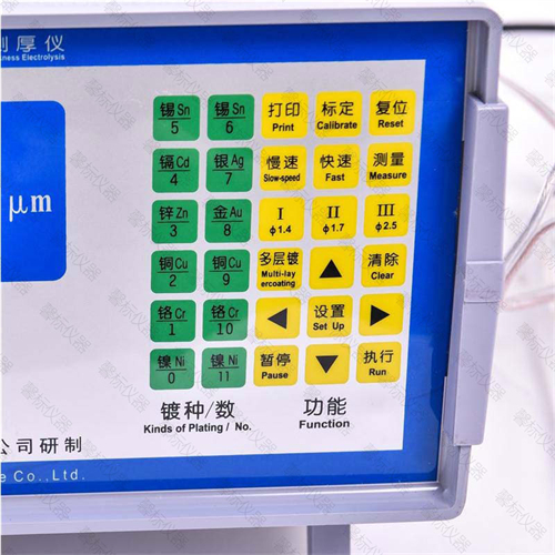 Main functions and features: 1. This product uses independently developed chips to process data, with high-speed serial port, high-speed A/D, precision, compatibility, anti-interference, long service life, and technical front-end capabilities. 2. Switching between Chinese and English interfaces for LCD display, with high display quality, digital interface, small size, light weight, and low power consumption. 3. The thermal printer needs to be used for a long time without replacing the ribbon. Micro printing interface for printing test reports in both Chinese and English, printing coating type, thickness, testing personnel, date, internal clock calendar, no need to set each time; 4. Automatically pause measurement prompt to replace electrolyte. To reduce measurement errors; 5. Automatically calculate the average value. Below 10 microns are three decimal places with an accuracy of 1/1000; 6. Can measure multi-layer plating such as Cr/Ni/Cu/plastic, the report can be printed out at once without the need for disassembly printing; 7. Using imported standard plates from the United States, calibration and calibration achieve ideal measurement error values. Adjustable conductivity coefficient reduces errors; 8. Adjust the endpoint potential difference to adapt to the appropriate potential between the coating and substrate; 9. By measuring more than 70 combinations of metal coating substrates, it can measure coatings on flat and curved surfaces, as well as small parts, wires, and linear parts; 10. Plating removal speed 0.3-40 μ M/minute adjustable; 11. The vacuum squeezing air pump is used for cyclic stirring, and the stirring force and gas volume can be adjusted according to the coating to achieve a suitable dissolution state; 12. The electrolytic cup is made of corrosion-resistant alloy stainless steel, which is not prone to corrosion and aging; 13. Adjustable constant current to achieve suitable electrolysis efficiency; 14. The operation interface function matrix buttons are intuitive and convenient for operation and measurement, and input can be directly completed; 15. The matrix buttons use imported Omron or NKK, with a lifespan of over 10 million times.