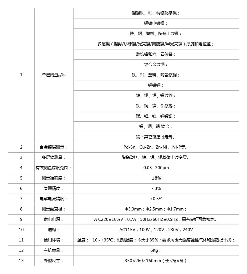 Device Name:Electrolytic thickness gauge (excluding computer) Equipment specifications:ET-3C Equipment introduction and functional characteristics: The ET-3C electrolytic thickness gauge has the characteristics of structure, stable and reliable performance, and complete functions. The use of this instrument can ensure the product quality of user units and prevent waste of raw materials. This instrument can also help users find electroplating processes that are suitable for different requirements, which is an instrument chosen by finished product factories and electroplating factories. Main functions and features: 1. This product uses independently developed chips to process data, with features such as high-speed serial port, high-speed A/D, precision, compatibility, anti-interference, long lifespan, and technical front-end; 2. Switching between Chinese and English interfaces for LCD display, with high display quality, digital interface, small size, light weight, low power consumption, etc; 3. The thermal printer needs to be used for a long time without replacing the ribbon. Micro printing interface for printing test reports in both Chinese and English, printing coating type, thickness, testing personnel, date, internal clock calendar, no need to set each time; 4. Automatically pause measurement prompt to replace electrolyte. To reduce measurement errors; 5. Automatically calculate the average value. Below 10 microns are three decimal places with an accuracy of 1/1000; 6. Can measure multi-layer plating such as Cr/Ni/Cu/plastic, the report can be printed out at once without the need for disassembly printing; 7. Using imported standard plates from the United States, calibration and calibration achieve ideal measurement error values. Adjustable conductivity coefficient reduces errors; 8. Adjust the endpoint potential difference to adapt to the appropriate potential between the coating and substrate; 9. By measuring more than 70 combinations of metal coating substrates, it can measure coatings on flat and curved surfaces, as well as small parts, wires, and linear parts; 10. Plating removal speed 0.3-40 μ M/minute adjustable; 11. The vacuum squeezing air pump circulates stirring, and the stirring force and gas volume can be adjusted according to the coating to achieve a suitable dissolution state,; 12. The electrolytic cup is made of corrosion-resistant alloy stainless steel, which is not prone to corrosion and aging; 13. Adjustable constant current to achieve suitable electrolysis efficiency; 14. The operation interface function matrix buttons are intuitive and convenient for operation and measurement, and input can be directly completed; 15. The matrix buttons use imported Omron or NKK, with a lifespan of over 10 million times; 16. The thickness gauge host adopts a high-speed USB interface for transmission and can be connected and compatible with various laptops, achieving better operational display. The software automatically captures accurate coating thickness curves with the machine. This model can test the copper plating function on copper. This model can be connected to a computer, and the curve direction can be observed. The results can generate office files for long-term storage and A4 paper printing reports; 17. Measurement of multi-layer nickel thickness and potential difference: This model of instrument can measure the total thickness of multi-layer nickel at once (nickel seal, pearl nickel, bright nickel, high sulfur nickel, semi bright nickel). Can analyze the thickness and potential difference of each layer of coating. For example: chromium/bright nickel/high sulfur nickel/semi bright nickel/nickel seal/Cu/plastic, while measuring the thickness and electrochemical potential of double-layer or three-layer nickel coatings. The ET-3 electrolytic thickness gauge has a high voltage resolution and can measure the potential between micro porous nickel or microcracked nickel on the top layer and bright nickel on the bottom layer, as well as the potential between bright nickel and semi bright nickel. (If necessary, it can also be high sulfide nickel between bright nickel and semi bright nickel); It is possible to measure the thickness of metal coatings on almost all metal or non-metal substrates, even in multi coating systems.
