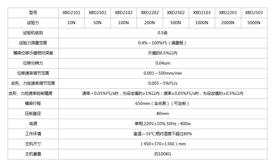 Equipment name: Microprocessor controlled electronic universal testing machine Product models: XBD2101, XBD2501, XBD2102, XBD2202, XBD2502, XBD2103, XBD2203, XBD2503 Main functions of the equipment: This machine is used for testing and analyzing the static mechanical properties of metal and non-metal (including composite materials) adhesives, adhesive tapes, stickers, medical adhesives, protective films, release papers, composite films, food plastic bag packaging, daily cosmetic plastic packaging, artificial leather, woven bags, films, and paper in terms of tension, compression, bending, shearing, peeling, tearing, load holding, relaxation, and reciprocating, and can calculate the tensile strength Parameters such as bending strength, compressive strength, elastic modulus, fracture elongation, yield strength, etc. And can conduct tests and provide data according to relevant domestic and international standards such as GB, ISO, DIN, ASTM, JIS, etc. Test standards met by the equipment: Manufacturing standard for testing machines: GB/T 16491-2022 Electronic Universal Testing Machine; Meet the testing method standards: GB/T1040-2006 "Determination of Plastic Tensile Properties" GB/T1041-2008 "Determination of Plastic Compressive Properties" GB/T9341-2008 "Determination of Plastic Bending Properties" GB/T13022-1991 "Test Methods for Plastic Film Tensile Properties" (Users can provide relevant testing standards, not exceeding 5) The main components of the equipment are: (1) Mechanical process structure: The main frame is mainly composed of a base, three pillars, and a lead screw to form a single arm frame structure; The transmission loading system adopts an AC servo motor and a synchronous toothed belt deceleration device, which drives the high-precision ball screw to rotate and then drives the moving crossbeam to achieve loading. This machine has a beautiful appearance, good stability, high rigidity, high control accuracy, high work efficiency, low noise, and is energy-saving and environmentally friendly. (2) Control and measurement system: This machine adopts an advanced fully digital closed-loop control system for control and measurement, and uses a computer to dynamically display the test process and test curves, as well as perform data processing. After the experiment is completed, the curve can be magnified through a graphics processing module for data analysis and editing, achieving superior performance.